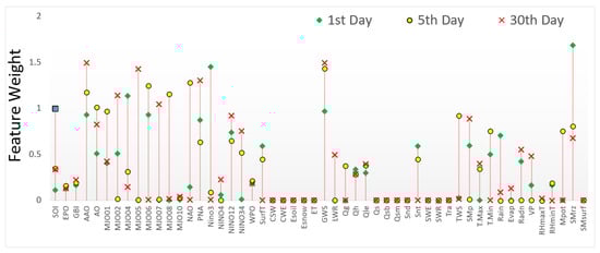 Feature weight matrix of predictor variables from a pool of 52 data sources using neighbourhood component analysis at the nth (n = 1, 5, and 30) day lead time forecasting of surface soil moisture shown for the case of Menindee study station. Details of the variables are mentioned in Table 2.