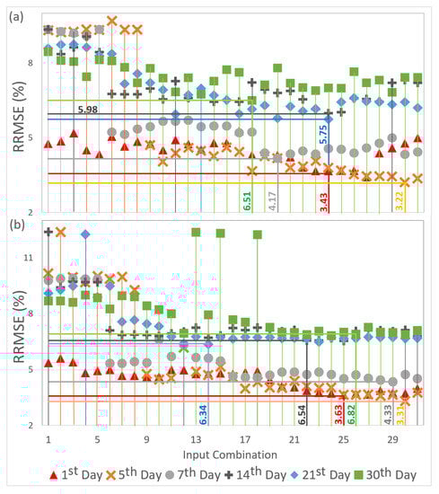 Stair plot showing the relative root mean squared error (RRMSE, %) for (a) CNN-GRU and (b) GRU applied at different input combinations for the Menindee station at the 1st, 5th, 7th, 14th, 21st and 30th day lead time.