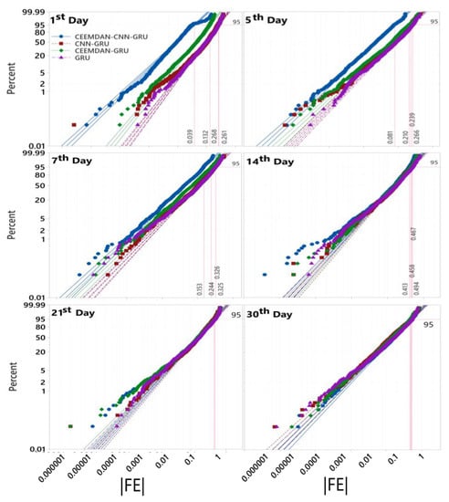 For the 5th day of SSM forecasting, the results of the objective model for Menindee had the best performance (r = 0.993; NSE = 0.991; RMSE = 0.040 kg m−2) followed by Deniliquin (r = 0.989; NSE = 0.975; RMSE = 0.091 kg m−2). Likewise, for the 7th, 14th, 21st, and 30th days of SSM forecasting, the CEEMDAN-CNN-GRU model outperformed the other models by a notable margin for all the respective periods of SSM forecasting. However, a site-specific signature in the model accuracy was also evident, with the results for Menindee registering the lowest value of RMSE generated by the CEEMDAN-CNN-GRU model. In terms of MAE, the CEEMDAN-CNN-GRU model returned the lowest value for Menindee, suggesting that the CEEMDAN-CNN-GRU model was a potential forecasting tool SSM at the 1st, 5th, and 7th day ahead periods. Not surprisingly, in accordance with other studies, e.g., the present study indicates that as the length of the forecasting period was increased, the model’s performance appear to reduce at a significant rate in such a way that the r-values reduced by 0.30%, 1.10%, 9.15%, 11% and 15% for the 1st to 5th, 7th, 14th, 21st and 30th day of SSM forecasting. The change of the performance metrics (i.e., NSE, MAE, and APB) for longer-term horizons relative to the shorter-term horizons also concurred with the respective changes in the r-values and is consistent with earlier studies [,]. For a longer-term horizon, the present r value was lower, and the MAE increased, suggesting that for the longer forecast horizon, the model appeared to lose the relevant data features in the predictor variables required to maintain precise SSM forecasting performance. The hybrid CEEMDAN-CNN-GRU model is further evaluated using a probability plot of errors at the 95th percentile, including those of the benchmark model (i.e., CNN-GRU, CEEMDAN-GRU) and the standalone model (i.e., GRU) with an illustration for Menindee at the different nth (n = 1, 5, 7, 14, 21 and 30) days (Figure 6). The CEEMDAN-CNN-GRU model results show that ~95% of SSM forecasting had the lowest error (<0.1) for the 1st and 5th days of SSM forecasting. Among all the predictive models and the forecast periods over nth days, the GRU-based model showed a more significant proportion of |FE| values at a 95% confidence level. Notably, consistently good results were also achieved for the other stations (i.e., Deniliquin, Fairfield, and Gabo Island), which are shown in supplementary materials (Figure S1a–c). The lowest value of |FE|, with <0.063 with a 95% percentile, was evident for Fairfield compared to the other two study stations. The correlation between observed and forecasted daily surface soil moisture datasets generated by the proposed CEEMDAN-CNN-GRU model vs. the corresponding benchmark models (i.e., CNN-GRU and GRU), for the case of Menindee station, is illustrated in Figure 7. The correlations for the hybrid GRU model are positioned close to the observed SSM values up to the 7th day, revealing a high degree of forecasting accuracy. An improvement in the model’s forecasting performance was attained by applying the CNN algorithm (i.e., soil moisture generated by the CNN-GRU model) and data decomposition (i.e., CEEMDAN-CNN-GRU) method on standalone GRU model. The disparity between the forecasted SSM and the reference SSM values was significantly higher for the 14th, 21st, and 30th days of SSM forecasting, which concurs with earlier metrics suggesting a potential inadequacy of the data features long time ahead periods [].