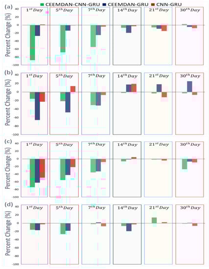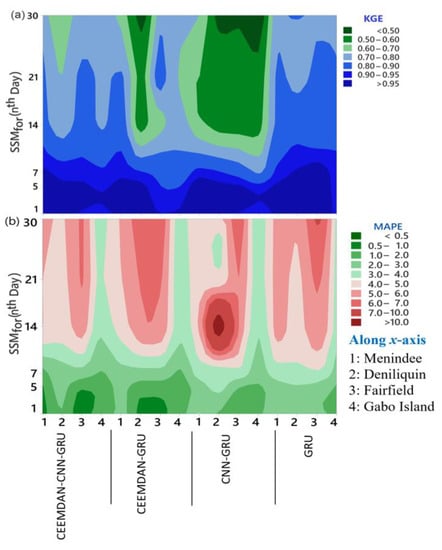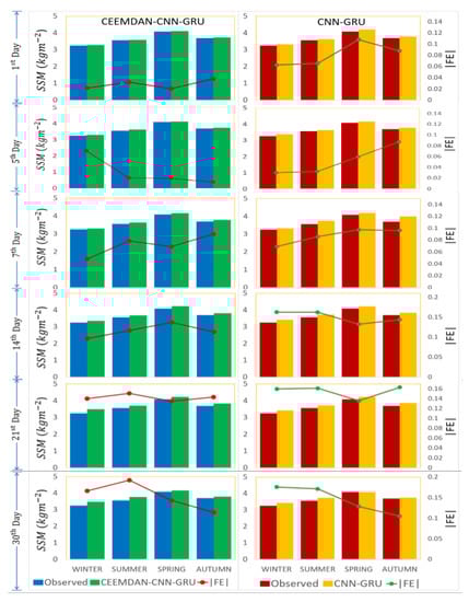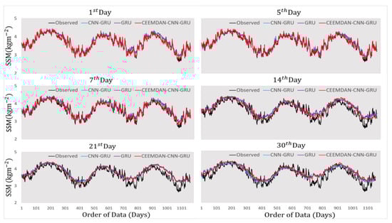 Before applying the CEEMDAN-CNN-GRU model in the 1st, 5th, 7th, 14th, 21st, and 30th day SSM forecasts, hyperparameter selection is undertaken through a grid search procedure whose theoretical descriptions are provided in Section 2. Table 3 shows the hyperparameters, optimal GRU architecture, and CNN-GRU with input combinations deduced from the feature weight matrix. Finally, the deep learning forecast model combining a data decomposition (i.e., CEEMDAN) stage with a three-layered feature extraction stage (i.e., CNN) and feature selection stage (i.e., fsrnca) is implemented to forecast SSM.