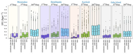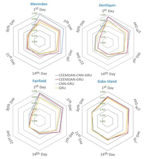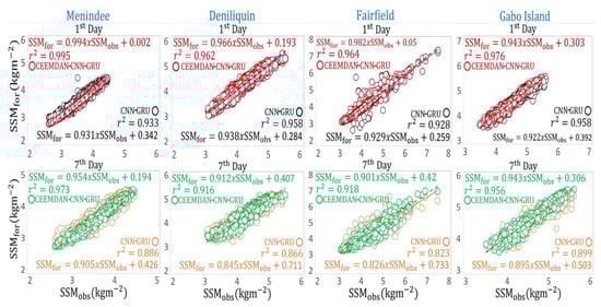 Figure 8 shows a scatter plot of forecasted and observed SSM for the 1st and 7th days across the Murray Darling Basin with a least square regression line, y = mx + C, and the coefficient of determination in each sub-panel. Notably, the objective model (i.e., CEEMDAN-CNN-GRU) is seen to attain more accurate results with considerably larger r2 values. The SSM forecast with a hybrid deep learning model for Menindee station performed significantly better than the comparative model (i.e., CNN-GRU). In the case of Menindee, for example, the values for m and r2 are in reasonably good agreement against the 1:1 line representing the forecasted and observed SSM values in such a way that (m|r2) is 0.994|0.995 for the hybrid CEEMDAN-CNN-GRU model relative to (0.931|0.933) for CNN-GRU for the 1st day ahead of SSM forecasting. Moreover, for the 1st day of SSM forecasting, the CEEMDAN-CNN-GRU model provided results in significant proximity to the other three stations, such as Deniliquin: 0.962|0.966, Fairfield: 0.928|0.964, and the Gabo Island: 0.958|0.976). Alternatively, the y-intercept of the regression line was close to trivial, i.e., 0.002 (Menindee: 1st day), 0.193 (Deniliquin: 1st day), 0.05 (Fairfield:1st day), and 0.303 (Gabo Island:1st day), revealing the efficacy of the deep learning hybrid method for surface soil moisture forecasting. For the 14th, 21st, and 30th day ahead of SSM forecasting, the y-intercept, as expected, deviated slightly from the ideal value of 0, caused by more outliers between simulated and reference values in the testing phase.