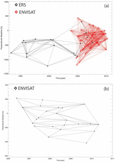 Examples of SB InSAR data pair distributions in the temporal/perpendicular baseline domain. (a) SAR data collected by the ERS/ENVISAT sensors in Yellowstone, U.S. (track 41, frame 2709) region. The applied thresholds on the maximum geometrical and temporal baselines are 800 m and three years, respectively. (b) A triangular-shaped network of SB interferograms related to a SAR data set collected by the ENVISAT sensor (ascending orbit, VV polarization) in the area of Pearl River Delta, China, from 2006 to 2010.