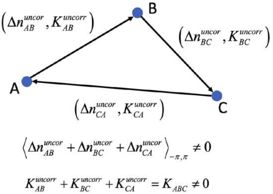 , on the other hand, is the contribution of the phase noise that is time-uncorrelated. Hence, these phase components are temporally inconsistent. It means that considering a triplet of SB interferograms generated from three SAR images (namely A, B, C), and forming a closed loop (namely AB, BC, CA), the sum of the relevant uncorrelated phase noise contributions differs from zero, namely [22,24,32,70], where the symbol is the wrapping operator (see Figure 2). This phase term is the composite effect of small random alterations that determine the temporal-inconsistency of statistical operations, such as those involved in the generation of multi-looked SB interferograms or due to systematic errors in the operations of co-registration and noise filtering of every single data pair, when these operations are independently applied to every single interferogram. Unlike these statistical inconsistencies, this phase noise contribution also takes into account a lack of consistency related to underlying physical reasons connected to the electromagnetic waves’ different scattering mechanisms with the imaged objects. Some recent works [53,74,75] investigated this problem from the statistical and physical point of view, shedding light on the potential application of these inconsistencies to retrieve some parameters of interest of the underlying physical phenomena.