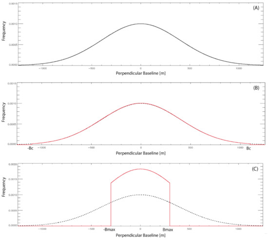 Theoretical Distribution of the perpendicular baselines of the InSAR data. (A) Normal distribution of the perpendicular baseline of InSAR data pairs. (B) Distribution of the perpendicular baselines of the InSAR data pairs below the critical baseline boundary. (C) Distribution of the perpendicular baseline of the selected small baseline interferograms obtained by imposing a maximum allowed absolute perpendicular baseline equal to Bmax.