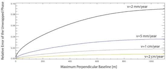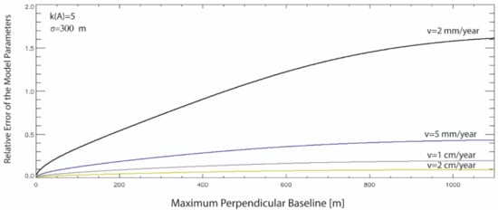 where the following approximation was also considered. From Equation (27), it could be seen that the relative error of the input data depended on the operating wavelength and the mean deformation velocity , as well as on the selected maximum perpendicular baseline value . Figure 7 shows the plot of the relative error versus the selected maximum perpendicular baseline for the different values of the mean deformation velocity of the given point on the ground, considering a SAR platform operating at the C-band, with a wavelength of about 5.6 cm of the transmitted signals, a multi-look factor , an InSAR temporal average root mean squared value equal to , and a value of the standard deviation of the perpendicular baseline equal to 300 m. The considered parameters were relevant to the first-generation C-band SAR sensors, but similar calculations could be adapted to the new generation of SAR sensors.