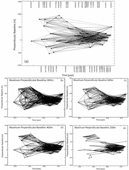 Sets of SB interferograms relevant to South California’s area obtained by processing a group of ENVISAT/ASAR images. The SB InSAR data pairs are identified by imposing a constraint on the maximum perpendicular baseline of (a) 1100 m, (b) 800 m, (c) 600 m, (d) 400 m, and (e) 200 m. Dates shown in this Figure are expressed with the format (day, month, year).