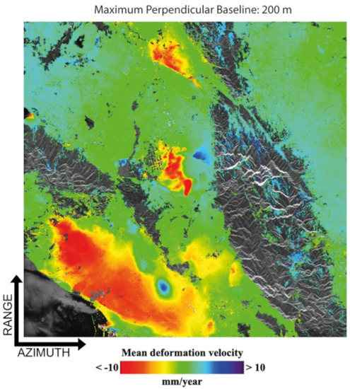 Figure 9 shows the selected InSAR data pairs’ distribution in the temporal/perpendicular baseline plane for the five tests performed by considering thresholds of 1100 m, 800 m, 600 m, 400 m, and 200 m on the maximum perpendicular baseline of the SB InSAR data pairs, respectively. The total group of 729 differential SAR interferograms, with a time separation shorter than 1000 days, were preliminarily, and independently, unwrapped using, for the sake of simplicity, the minimum cost flow phase unwrapping method proposed in [90]. For every set of SB interferograms, the SBAS inversion procedure was applied, and the relevant ground deformation time-series and the associated temporal coherence maps were obtained. As an example, Figure 10 shows the mean deformation displacement map of the area obtained by processing the group of interferograms shown in Figure 9e that corresponded to a threshold on the maximum perpendicular baseline of 200 m. The map shows the ground displacement information related to 228,318 well-processed radar pixels, exhibiting a temporal coherence value higher than 0.7, which was a suitable threshold.