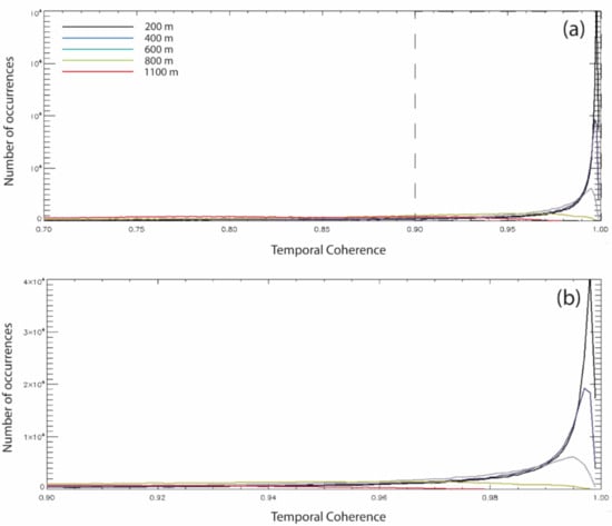 where is the vector of the residues of the LS solution of the system of Linear Equation (4). Accordingly, the significant uncorrelated phase terms and phase unwrapping mistakes translated to low values of temporal coherence. Thus, those pixels with values of the temporal coherence below a fixed threshold (e.g., 0.7) were discarded from the consequent analyses.