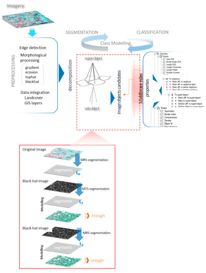 Unlike in traditional per-pixel-based image classification, which solely sits on the brightness values of individual pixels, the GEOBIA considers groups of pixels that form homogenous objects. In general, this object resembles real-world entities. The success of GEOBIA relies on its prime design goal of meaningfully grouping pixels (rather than treating them as single entities) by cross-pollinating spectral, textural, geometric, topological, and contextual information. The GEOBIA utilizes a cohesive methodological platform for machine-based characterization and classification of spatially relevant real-world entities, incorporating multiscale regionalization techniques augmented with nested representations and rule-based classifiers [61,62,63]. This kind of integrated framework, linking the concept domain and digital domain, is vital in landform mapping [64], because the imagery-based feature extraction can be supplemented and guided with expert knowledge [65]. Fundamentally, GEOBIA sits on two pillars: segmentation and classification. The former involves the creation of image objects using segmentation algorithms, whereas the latter attempts to semantically map “image” objects to “real-world” objects [58]. Overall, re-segmentation and re-classification provide an expert-based iteratively refining model for the semantic classes in question. Figure 2 illustrates our multi-scale trough modelling workflow. The ultimate goal is to create a meaningful link between low-level features (defined on image object candidates) and high-level semantics (class labels) in the image via multiscale segmentation and knowledge-based rulesets.