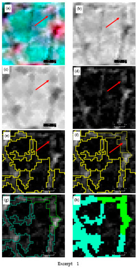 A visual progression of our multiscale trough modelling approach is illustrated in Figure 3, which contains three excerpts (Figure 3, Excerpt 1–3) selected from site-1. Each excerpt houses the original multispectral image (a) and corresponding gray-scale image (b) composed from the visible channels and morphologically processed images (erosion (c) and black-hat operation (d)). Segmentation and classification results (e–h) are overlain on the black-hat image. In general, when inspecting the multispectral and grayscale images (Figure 3, Excerpt 1–3, a–b), it is evident that troughs do not readily stand out as unique (and continuous) entities but rather blend in the background spectral details (for example, see the red dotted circle on (a) of Excerpt 2). The erosion operation was able to open the dark objects while closing bright areas to a certain degree. The black-hat operation was very successful in delineating troughs as continuous entities. For example, as seen on (d) of Excerpts 1 and 2, it is difficult to even visually delineate the trough (see red arrow) as a continuous geo-object. In contrast, corresponding black-hat images have clearly provided ample visual cues to capture trough outlines. The first operation of segmentation on the black-hat images partly captured the troughs (see the thick yellow lines and red arrows on (e) of Excepts 1–2). The remainder of the trough objects was addressed by the second cycle of segmentation (see the thin yellow lines accompanied with red arrows of (f) of Excerpts 1–2). As seen on (e) and (f) of Excerpt 3, the trough shown under the red-dotted circle was completely overlooked in the first segmentation cycle but captured at the next level. Figure 4 depicts a side-by-side comparison of the segmentation results (red outlines shown on (d) and (e)) obtained from the multiresolution segmentation algorithm using the original multispectral imagery (a) and the black-hat image (b) (i.e., morphologically processed multispectral image). A close inspection of the image segments underlying the yellow-dotted rectangle reveals the greater geometrical resemblance of the image segments (e) produced from the black-hat image than those of the multispectral image (d), in which the actual trough object has largely been exposed to under-segmentation.
