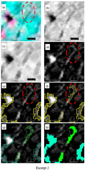 Excerpts 1–3 from candidate image scene 1 (site 1) illustrating how trough objects are modelled through multiscale segmentation and classification. (a) original image (false-color composite), (b) synthesized grayscale image from RGB bands, (c) eroded mean band, (d) top-hat image of mean band, (e) level 1 segmentation (thick yellow outline) of top-hat image, (f) level 2 segmentation of top-hat image (thin yellow outline), (g) Classified trough (as hollow outlines) based on level 1 segmentation (cyan), level 2 segmentation (green), (h) final classification level 1 (cyan), level 2 (green). Satellite imagery Copyright DigitalGlobe, Inc.