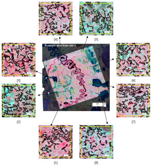 Figure 5 and Figure 6 depict the zoomed-in views of automatically extracted trough objects (black hollow outlines overlain on false color imagery) from site 1 and site 2, respectively. We used these test areas to visually inspect the segmentation quality and classification accuracy of the extraction workflow. Of the eight close-ups presented in Figure 5, in the majority of cases, the master ruleset was able to successfully extract over 90% of the trough objects presented in the imagery. False detection was almost zero. Automatically extracted trough boundaries resembled real-world discontinuities, showing a high degree of spatial congruence with manual delineation. Zoomed-in views (2) and (3) of Figure 5 show comparatively low detection. This is most likely attributed to the ill-pronounced nature of troughs as dark objects that eventually trigger the black-hat operation. Figure 6 depicts the classification results from the direct application of the master ruleset on site-2. A careful inspection of the zoomed-in views reveals that our approach shows the same level of performances as for site-1. In general, we were able to accurately detect and delineate approximately 85–90% of the trough objects in the images. Because of the scene complexity associated with the tundra type, we observe slightly higher false positive rates for site-2, where troughs are typically irregular without forming strong networks. They are generally dry, shallow, and texturally smooth, and edges are not prominent. Collectively, these factors drive the segmentation process. Compared to site 1, here we observe a higher degree of under-segmentation, leaving mixed objects (i.e., trough and background as a single segment).
