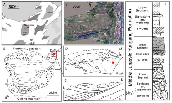 Geological setting of the outcrop area (modified from Yu (2002) and Cheng (1997) [,]). (A) Location of the Ordos Basin. (B) Paleogeography of the Ordos Basin in J2. The Datong area is at the northeast of the basin. (C) Aerial view of the unmanned aerial vehicle (UAV) survey area in this study. This map is from a 3D digital outcrop model built for this study. (D) Geological map of the study outcrop area. (E) Geological profile of the study outcrop area. (F) Strata column of the Yungang Formation, J2 in the outcrop area. The outcropped rocks are part of the Rock Cave member in the middle segment of the Yungang Formation.