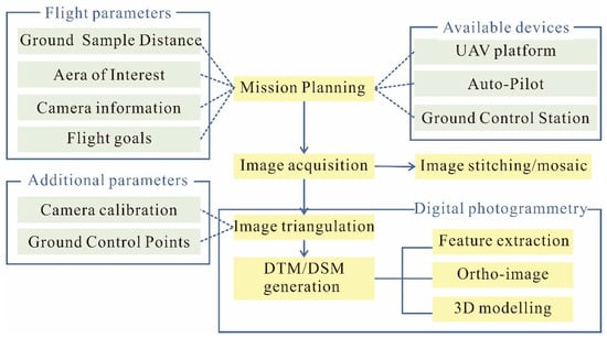UAV data acquisition and processing workflow (after Nex and Remondino, 2013). DTM: digital terrain model; DSM: digital surface model.