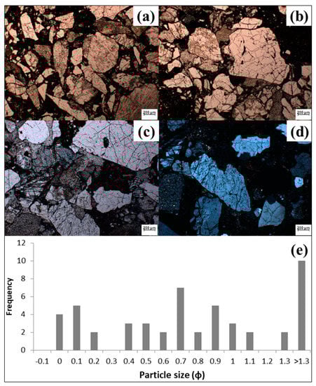 (a–d) Thin section pictures and (e) particle size distribution of outcrop area. The rocks in (a–d) are arkose graywacke and lithic graywacke with a high argillaceous matrix content. A little calcite cement can be identified in c and d. The overall grain size of the clastic particles was coarse, and the sandstone was mainly medium to coarse. The component maturity and structural maturity were low, roundness was sub-angular to angular, and sorting was medium.