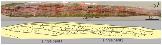 Braided bar four (Figure 8) was observed to be composed of two single bars with four periods of unit bar accretion. The spatial association of these unit bars appears as a lateral migration and vertical accretion. The geometry parameters of these bars were measured from the outcrop model (Table 3), whereby the average width and thickness of the accretion bodies were 35.2 m and 2.73 m, respectively. A hollow was located within the top of the compound bar between the two single bars. The hollow bottom was a weak erosive surface and was convex from the top-down perspective.