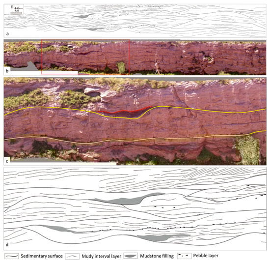 Photograph and reservoir architecture sketch of a cross profile in the southern part of braided bar 3 (see Figure 2). The section outcrops by the railway cutting. (a) Reservoir architecture sketch of the outcropping profile; (b) photograph of the cross profile from the UAV digital model; (c) partially enlarged photograph of the profile in (a,b). The area is marked with a red square box in picture (b); (d) reservoir architecture sketch of the profile in photograph c.
