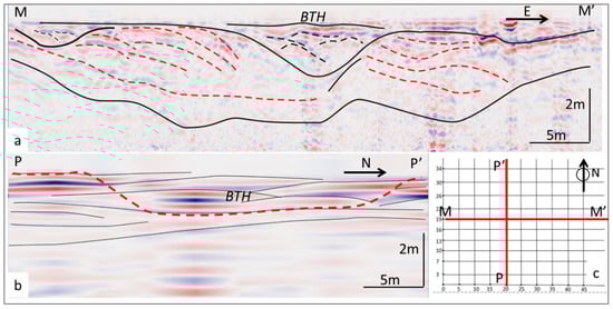 Ground penetrating radar (GPR) profiles in the northern part of braided bar 3. The entire 3D GPR survey was conducted in the compound braided bar marked in Figure 2a. In cross-section profile M-M’, (a) BTH unit within the compound bar can be seen between two unit bars. (b) In longitudinal profile P-P’, an electromagnetic reflection association of the BTH is present as a unit with a concave-up bottom and level top. (c) GPR survey grid in the planar view.