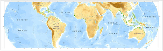 Distribution of the mangrove forests (green) of the world for the year 2000 at 30 m spatial resolution [1].