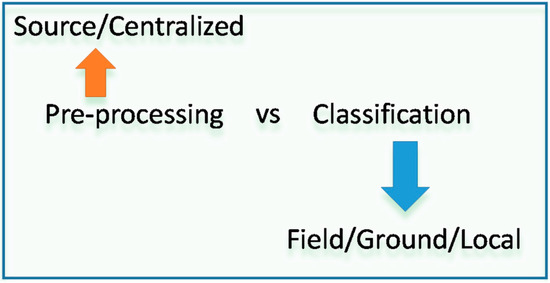 Conceptual framework of pre-processing and image classification showing centralized versus field/ground/local level processing.