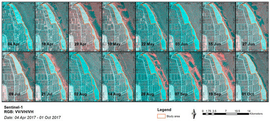 All Sentinel-1 data used in this paper can be available and downloaded freely from the Copernicus Open Access Hub (https://scihub.copernicus.eu/, (accessed on 27 December 2017)). Sentinel-1 is a near-polar solar synchronous orbit satellite (including Sentinel-1A and Sentinel-1B) and it has an advantage in providing continuous imagery with a six-day revisit time operating in the C-band instrument through the European Space Agency (ESA). In this study, only 16 Sentinel-1A scenes from 4 April 2017 to 1 October 2017 (Figure 2) were applied, as the Sentinel-1B data were unavailable during the vegetation growing period. The images of growing duration were applied because they were thought to have a greater priority than representing the vegetative variations. The selected radar images were obtained in interferometric-wide (IW) mode and were Level-1 Ground Range products.