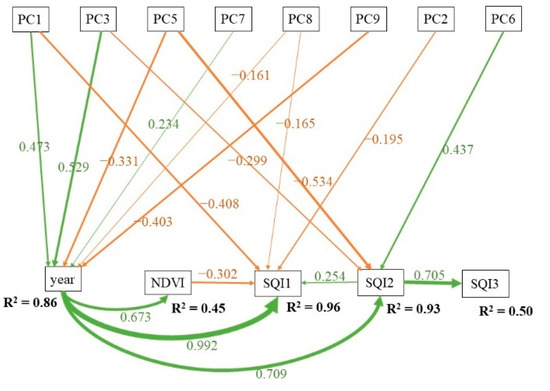 In addition, quantitative results among the observed variables were obtained. The impact of the invasion age on NDVI was 0.673, and the NDVI value in the model was only determined by the invasion age. At the same time, the NDVI value played a negative role in forming the surface SQI at 0–30 cm, with an influence coefficient of −0.302. Moreover, it is easy to observe that the invasion process participates in the simulation of the above two soil layers, playing an important role in soil development at the 0–60 cm depth interval, and the coefficients were 0.992 and 0.709. From the prospect of depth, the SQI at 0–30 cm was affected by the SQI at 30–60 cm with a standard coefficient value of 0.254, which also exerted positive impacts on the SQI at 60–100 cm with an influenced coefficient value of 0.705.