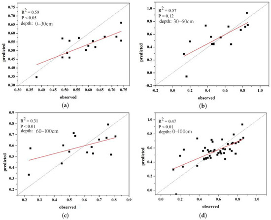 Table 4 presents the values of ME, RMSE and RPD that resulted from the leave-one cross validation, revealing a successful model for SQI prediction in summary, especially for soils at a depth interval of 0–60 cm. The RPDs of the SQI in the middle layer and the upper 60 cm were 1.50 and 1.44, respectively, and the RMSEs were 0.16 and 0.13, respectively, showing the predictive capacity of the SQI in the upper 60 cm with the SEM model. The predicted and observed SQIs from the cross validation are plotted in Figure 5. The predicted values were in good accordance with the observations, with an R2 value of 0.47 and an RMSE of 0.14 (Figure 5d and Table 4). For the three depth intervals, the R2 values are 0.59 at 0–30 cm, 0.57 at 30–60 cm and 0.31 at 60–100 cm. Among them, the SQI in the middle layer was insignificant (p = 0.12).
