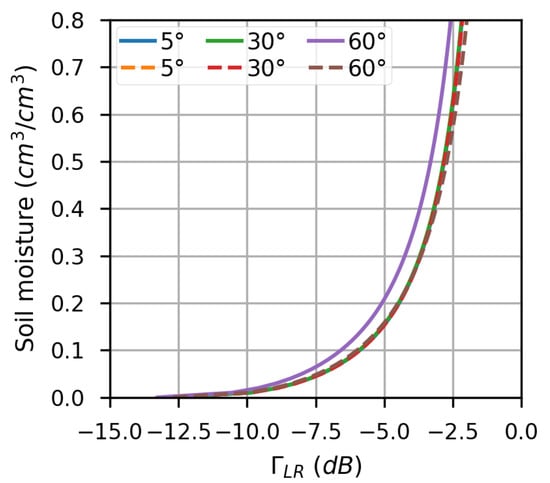 In previous spaceborne GNSS-R soil moisture retrieval studies, the primary methodology is to establish the relationship between GNSS-R derived land surface reflectivity and reference truth SM values, which assumes that coherent component dominates GNSS-R land scattering field. In the theory of surface electromagnetic scattering, the surface reflectivity is the function of the incidence angle of the incoming signal and the Fresnel reflection coefficient; the latter one is mainly affected by the near-surface SM []. Figure 3 simulates the relationship between reflectivity and SM at different incidence angles with the solid line, where the semi-empirical Dobson model is used to mapping the relationship between soil moisture and complex permittivity []. The surface reflectivity increases monotonously with soil becoming wetter, and the response of reflectivity to the change of SM from 0.0 cm3/cm3 to 0.7 cm3/cm3 can reach 10 dB. The effect of the incidence angle on the mapping relationship between SM and reflectivity is negligible when the incidence angle is less than 60°. In our CYGNSS SM inversion experiements, the DDM peak value of coherent scattered power is picked in the CYGNSS level-1 data as the left term of Equation (7). Since the small scale roughness and upwelling vegetation cover can attenuate the scattering signal, the roughness and vegetation correction in Equation (7) directly use the roughness coefficient and VOD parameter provided in SMAP product for individual observation. Although the influence of the signal incidence angle is small, the method proposed in [] is still used in this work. The effect of the incidence angle correction is represented by the dashed lines in Figure 3 as well.