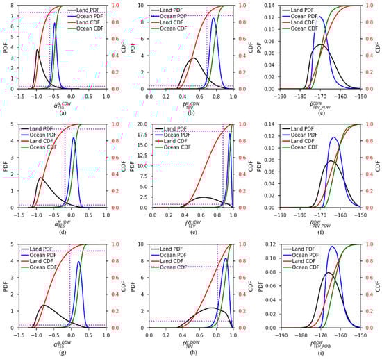 Statistic performance of trailing edge slope (TES), the average volume of the normalized time-delay waveform (DW) trailing edge (TEV), average absolute scattering power of the DW trailing edge (TEV_POW) derived from central Doppler time-delay waveform (CDW; a–c), integrated time-delay waveform (IDW; d–f), and deviation of time-delay waveform (DDW, g–i) over land and ocean surface, dataset collected from the cyclone global navigation satellite system (CYGNSS) level-1B in January 2018.