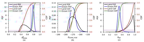 Average of the normalized scattering power DDM near its peak (DDMA) (a), an average of the absolute scattering power DDM near the peak (DDMA_POW) (b), and WAF-matched filter (MF) (c) statistic performance over land and ocean area, dataset collected from the CYGNSS level-1B in January 2018.