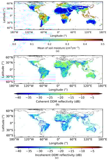 The global distribution of monthly average Soil Moisture Active Passive (SAMP) soil moisture (SM) (a), coherent reflectivity (b), and incoherent observations (c) in January 2018.
