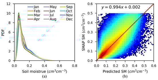 Monthly SMAP soil moisture probability density function (a) and density scatterplot of GNSS-R derived soil moisture and surface SM reference values in a split of k-fold cross-validation (b).