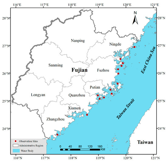 The Fujian Province is located on the southeast coast of China, in between 23°33′–28°20′N and 117°30′–120°40′E. Fujian has a long coastline of approximately 3752 km. This long and winding coastline hosts numerous bays and harbors. Its excellent geographical conditions promoted the development of an aquaculture industry and maritime transport. Fujian is close to the Tropic of Cancer, has a typical subtropical monsoon climate, and is warm and humid. Sufficient rainfall forms a dense water system with many rivers having different sizes. Freshwater and terrigenous materials are imported into the ocean through surface runoff. The aquaculture industry and residential areas are concentrated along the coastal areas. Some eutrophic and polluted water bodies are discharged into the coastal estuaries, thus worsening the quality of the coastal water with gradual eutrophication and frequent red tide events. Thus, the aquatic ecosystem is under great environmental pressure.