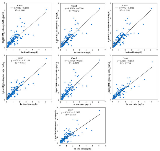 Improving the prediction accuracy is critical for chlorophyll inversion, and this is closely related to the choice of input feature variables. Therefore, on the basis of the LightGBM algorithm, the prediction accuracy of seven feature combinations for each case was evaluated using the testing sets, 181 pairs of OLCI remote sensing reflectance, and in situ chl-a values. The correlations between in situ observed values and predicted values based on the LightGBM model of each case are presented in Figure 3, and the performance indicators calculated for the seven cases are presented in Table 5.