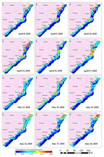 The coastal areas of Fujian are where red tide events seriously occur. Notably, from April to June each year, a high incidence of red tide is observed, according to relevant information released by the Fujian Ocean and Fisheries Bureau (http://hyyyj.fujian.gov.cn/) (accessed on 1 April 2020). Hence, to better understand the temporal and spatial variations of chl-a concentration in Fujian’s coastal waters and evaluate the applicability of the LightGBM-based model to estimate chl-a concentration, we applied the LightGBM model on the OLCI images to map the spatial distribution of chl-a concentration in April to June 2020. In this study, we selected 12 OLCI images (nearly cloudless) of Fujian’s coastal water areas. Then, we used the LightGBM-Case 4 method to obtain the time-series estimation of chl-a concentration in order to track the chl-a concentration variation process. Figure 4 presents the estimated results.