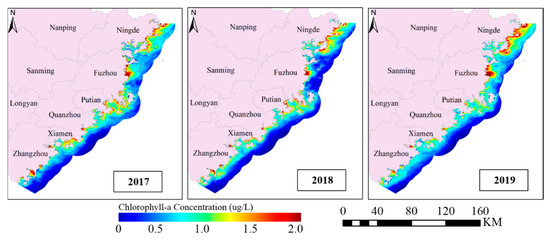 To further understand the characteristics of spatial and temporal distribution in Fujian’s coastal waters, we applied the LightGBM-based model to the OLCI images from 2017 to 2019 to generate time-series chl-a concentration. The annual and monthly averages were calculated on the basis of these time-series chl-a concentration values. Figure 5 and Figure 6 present the spatiotemporal distribution.