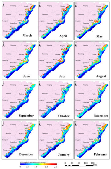 Spatial distribution of monthly average chl-a concentration based on the LightGBM model using the OLCI images from 2017 to 2019 in Fujian’s coastal waters.
