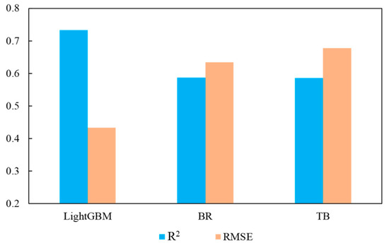 The data set was randomly divided into training sets (70%) and testing sets (30%) to train the model and verify its performance, respectively. In the modeling process, there are several important parameters for the LightGBM model: n_estimators is the number of base learners; learning_rate can control the convergence rate of the model; and num_leaves can adjust the model complexity. In this study, a grid-search method was employed to determine the optimal parameter of the LightGBM mode. First, a high learning_rate was selected (approximately 0.5). This is important for tuning to speed up the convergence and then increase n_estimators. Usually, with the increase n_estimators, the regression error will gradually decrease and then remain stable. This study tested the range of 50–1000 (interval of 50). Figure 2 shows that the error of the model tends to be stable when n_estimators = 400. Thus, we set the number of regression trees as 400. Next, we tuned num_leaves the same way; its value should not be set too large, otherwise, the problem of overfitting may occur. This study tested the range of 5–60 (interval of 5). The result revealed that num_leaves = 40 is appropriate. Finally, reducing the learning rate to improve the model’s performance found the best learning_rate in this study was 0.05. The other parameters were set as lambda_L1 = 1, lambda_L2 = 3, and boosting_type = gbdt. Following a series of experiments, we found that the model was very robust to changes in various hyperparameters. Table 4 shows the description of the imperative parameters of the LightGBM model and the optimal values after tuning.