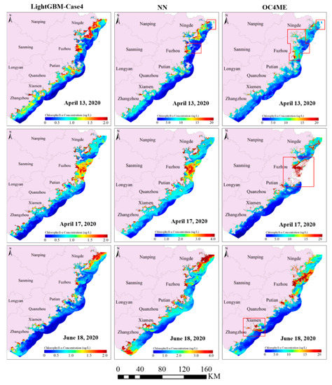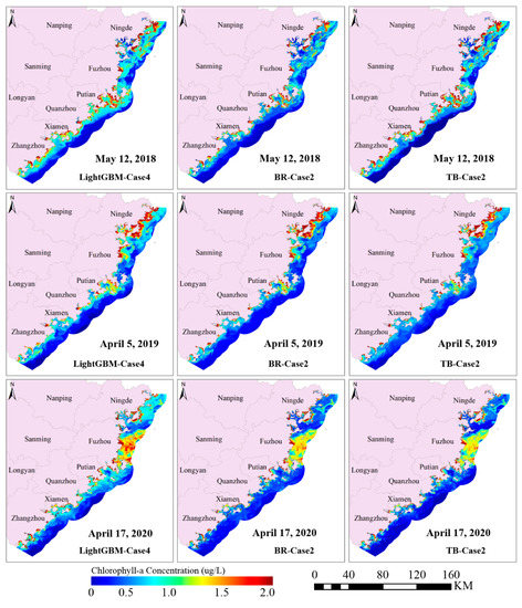 Spatial distribution of chl-a concentration based on the LightGBM-Case 4, BR-Case 2, and TB-Case 2 using the OLCI images on 12 May 2018, 5 April 2019, and 17 April 2020, in Fujian’s coastal waters.