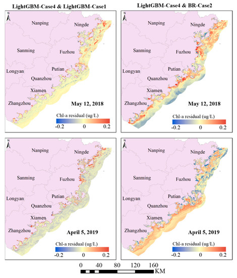 In order to show the result difference more intuitively between different models, we mapped the estimated chl-a bias between LightGBM-Case 4 and LightGBM-Case 1, and LightGBM-Case 4 and BR-Case 2. Figure 10 showed that the bias between the two LightGBM models (Case 4 and Case 1) are very small. While for the two different methods (LightGBM and BR), the bias is much greater. This indicated that the performance difference between LightGBM and BR models is relatively significant.