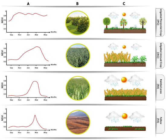 In this study, four farming system types (Figure 2A–C) have been selected to evaluate the effectiveness of phenological metrics in the characterization of changes. The farming systems are named (i) Irrigated Perennial Crop (IPC), (ii) Irrigated Annual Crop (IAC), (iii) Rainfed Area (RA), and (iv) Fallow (FA).