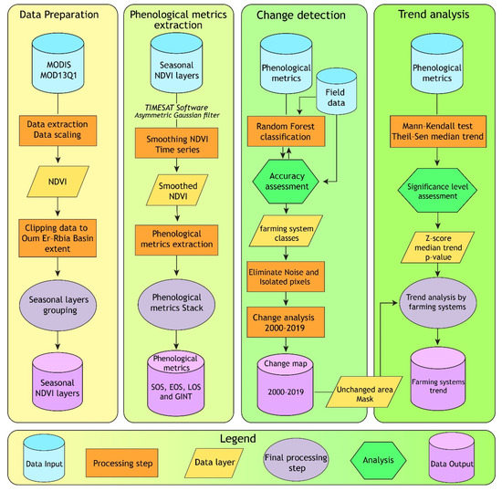 At present, many studies based on limited observations over some irrigated zones in the Oum Er-Rbia (OER) basin have been conducted, but fewer focused on large-scale analysis. Investigating the changes in farming systems at a large scale in the OER basin will have a far-reaching impact on agricultural sector development and how the system is adapting or not to climate changes. In this context, the present research sought to (i) use phenological metrics derived from twenty years of NDVI MODIS datasets (i.e., 2000–2019) to map and monitor changes in selected farming systems over a large arid-to-semi-arid region in Morocco (i.e., OER basin); (ii) investigate trends in selected farming systems at a large scale in the study area to evaluate how the systems are adapting or not to changes; and (iii) provide information on farming systems’ changes for stakeholders to adopt more accurate and efficient strategies.