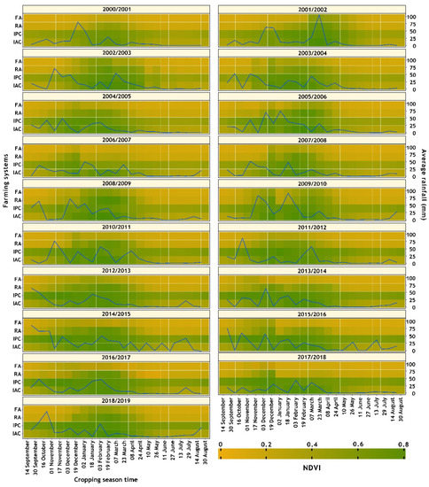 The phenology of the IPC farming system is characterized by permanent vegetative activity during the cropping season and high biomass production (Figure 2). IAC represents high inter-annual variability with a high amplitude and rapid growth and senescence moments. The IAC farming system is described with high vegetative activity with a maximum NDVI generally in March, low dependency on climate conditions and soil type, and a maintained growth cycle from seed to harvest time. The RA and FA farming systems are typical on semi-arid lands, where the start of vegetative activity depends on the climate conditions, especially the first rainfall. Figure 2 gives deep informative illustrations of the four farming systems investigated in this study.