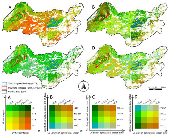 Figure 6. Bivariate maps showing, simultaneously, the great integral (A), length (B), end (C), and the start (D) of season and their coefficients of variation. High-resolution corresponding figures are provided with the Supplementary Materials.