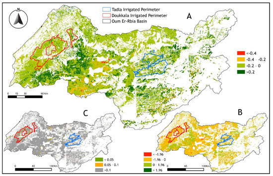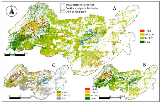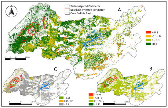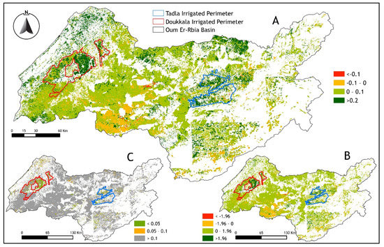 Figure 9. Spatial distribution of end of cropping season time (TEOS) trend. Maps (A), (B), and (C) represent Sen’s slope values, Kendall Z, and p-value intervals, respectively.