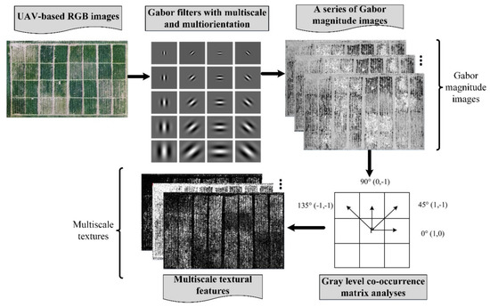 To capture the changes in winter wheat canopy during growing season well, multiscale textural features derived from high-definition UAV-based RGB images were required and expected to be more suitable for biomass estimation. To this end, we proposed a new texture extraction method, which took advantages of two-dimensional (2D) Gabor filter and GLCM analyses. For illustrative purposes, Figure 1 shows the schematic of the proposed multiscale texture extraction method (Multiscale_Gabor_GLCM). GLCM is computed for various angular relationships and distances between nearest pixel pairs in the image [26]. The textures derived from GLCM can well represent the spatial distribution of gray tones rather than the solely tones. The human visual system is regarded to have a special function to process information in multiresolution levels, which can be mimicked by changing the scale parameter in 2D Gabor filters [32]. Gabor filters are actually a series of local spatial band-pass filters, which are characterized by good spatial localization, orientation selectivity, and frequency selectivity [32]. In this study, four orientations ([0°, 45°, 90°, 135°]) and five scales (ν ∈ [0, 1, 2, 3, 4]) were considered to generate a bank of Gabor filters, which approximately uniformly covered the spatial-frequency domain. The settings of other parameters were the same with the literature [20]. According to our previous study [20], for UAV-based RGB images of winter wheat canopy, there was no significant heterogeneity in both Gabor- and GLCM-based textures of different orientations, and the textures of 45° were recommended. Thus, we only considered the orientation of 45° in the subsequent Gabor representation and GLCM analyses. For a ROI of winter wheat, each image band was convoluted with the Gabor filter bank, and a total of 15 Gabor magnitude images were generated. Then GLCM-based textures were extracted from each Gabor magnitude image to form multiscale image textural features. The used GLCM-based textures mainly included mean (Mean), variance (Var), homogeneity (Hom), contrast (Con), dissimilarity (Dis), entropy (Ent), second moment (Sec), and correlation (Cor) [26]. Consequently, a total of 120 textural features were extracted for each ROI image.