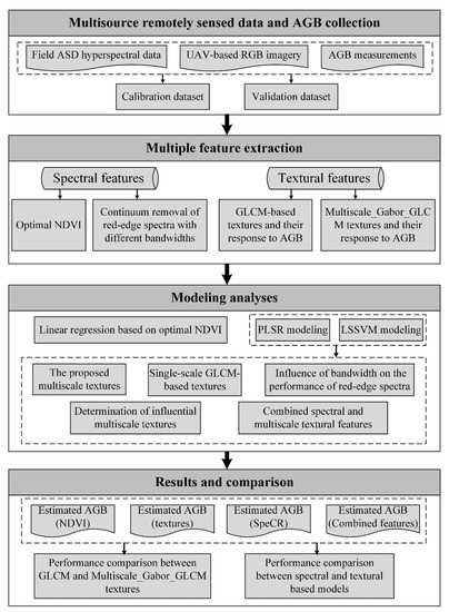 The goal of this study was to investigate if the proposed multiscale textures extracted from UAV digital images could compete with hyperspectral information for winter wheat biomass estimation. The specific objectives of this study were to (1) compare the predictive performance of optimal NDVI and continuum removal of red-edge spectra with different bandwidths; (2) evaluate the effectiveness of the proposed multiscale texture extraction method (hereafter referred to as Multiscale_Gabor_GLCM) and determine the optimal textural features for winter wheat biomass estimation; and (3) demonstrate if the combination of multiscale textures and spectral features (i.e., optimal NDVI and continuum removal of red-edge spectra) could further improve estimation accuracy.