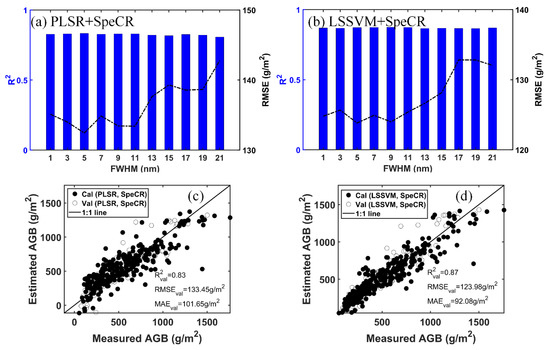 To investigate the influence of bandwidth on the predictive performance of continuum removal of red-edge spectra (SpeCR), both PLSR and LSSVM models were established based on the SpeCR under different bandwidths. In the comparison of Figure 4a,b, it could be observed that the predictive performance of the LSSVM regression models was generally better than that of the PLSR regression models. The RMSE values for the validation dataset generally increased with increasing bandwidth (Figure 4a,b). When the bandwidth exceeded 11 nm, the increasing RMSE values indicated that both LSSVM and PLSR models had an obvious decrease in predictive performance. Interestingly, both PLSR and LSSVM analyses on the SpeCR with a bandwidth of 1 nm did not produce the highest estimation accuracy. The PLSR model based on the SpeCR yielded the highest accuracy when the bandwidth was 5 (R2val = 0.83, RMSEval = 133.45 g/m2, and MAEval = 101.65 g/m2). The LSSVM regression model based on the SpeCR achieved the highest accuracy when the bandwidth was 9 (R2val = 0.87, RMSEval = 123.98 g/m2 and MAEval = 92.08 g/m2). Compared with the linear model based on the optimal NDVI-like, the optimal models based on the SpeCR significantly improved the estimation accuracy and decreased the RMSE value by 63.85~73.32 g/m2. As observed in the scatter plots between observed and estimated AGB (Figure 4c,d), to some extent, the models based on the SpeCR alleviated the underestimation problem for the AGB exceeding 800 g/m2, especially the LSSVM regression model.