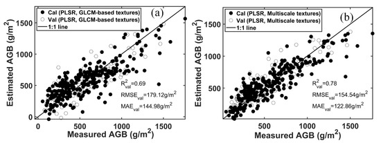 PLSR analyses were conducted uisng the single-scale GLCM-based textures and multiscale textures, respectively. Figure 6 shows the results of these models for both calibration and validation datasets. For the two PLSR models, the optimal latent factors were 11 and 10, respectively. Compared with the PLSR model based on the single-scale GLCM-based textures, the PLSR model based on the multiscale textures performed better with a R2 value of 0.78, a RMSE value of 154.54 g/m2, and a MAE value of 122.86 g/m2. This model increased the R2 value by 0.09 and decreased the RMSE value by 24.58 g/m2.