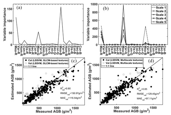 Predictive performance of the LSSVM regression models based on the selected GLCM-based textures (a,c) and selected multiscale textures (b,d) for winter wheat AGB estimation.